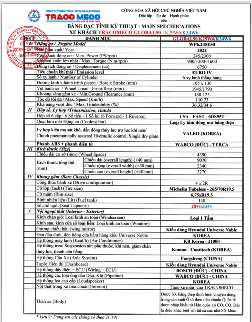 Xe Tracomeco Global Noble 34 chỗ Weichai 245ps là dòng xe được lắp ráp bằng thép định hình chuyên dùng trong sản xuất ô tô theo tiêu chuẩn quốc tế được nhập khẩu từ Hàn Quốc có giấy chứng nhận CO, CQ và áp dụng công nghệ sơn mạ tĩnh điện.
