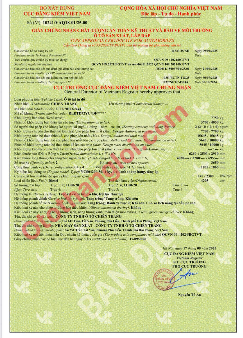 XE TẢI BEN CHIẾN THẮNG 7.7 TẤN , 2 CẦU CHỦ ĐỘNG , MODEL 2026 , LỐP 1100 , MÁY 200PS